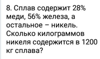 1) 28+56=84(%)-сплав содержит меди и железа.