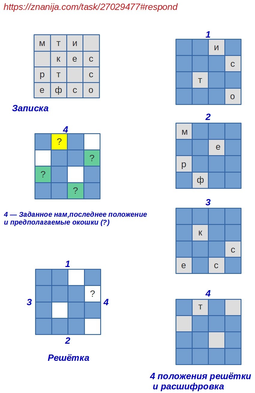 А вот дальше если укладывать решётку так как в примере получаем три тетрады (4х буквенные последовательности, полученные в одном положении решётки) и последнюю букву "т".