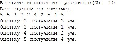 В школе N учеников 9 класса писали пробный экзамен по математике. Составить программу, подсчета количества 2,3,4,5, полученных за экзамен. Считайте оценку ученика случайным числом из диапазона от 2 до 5.