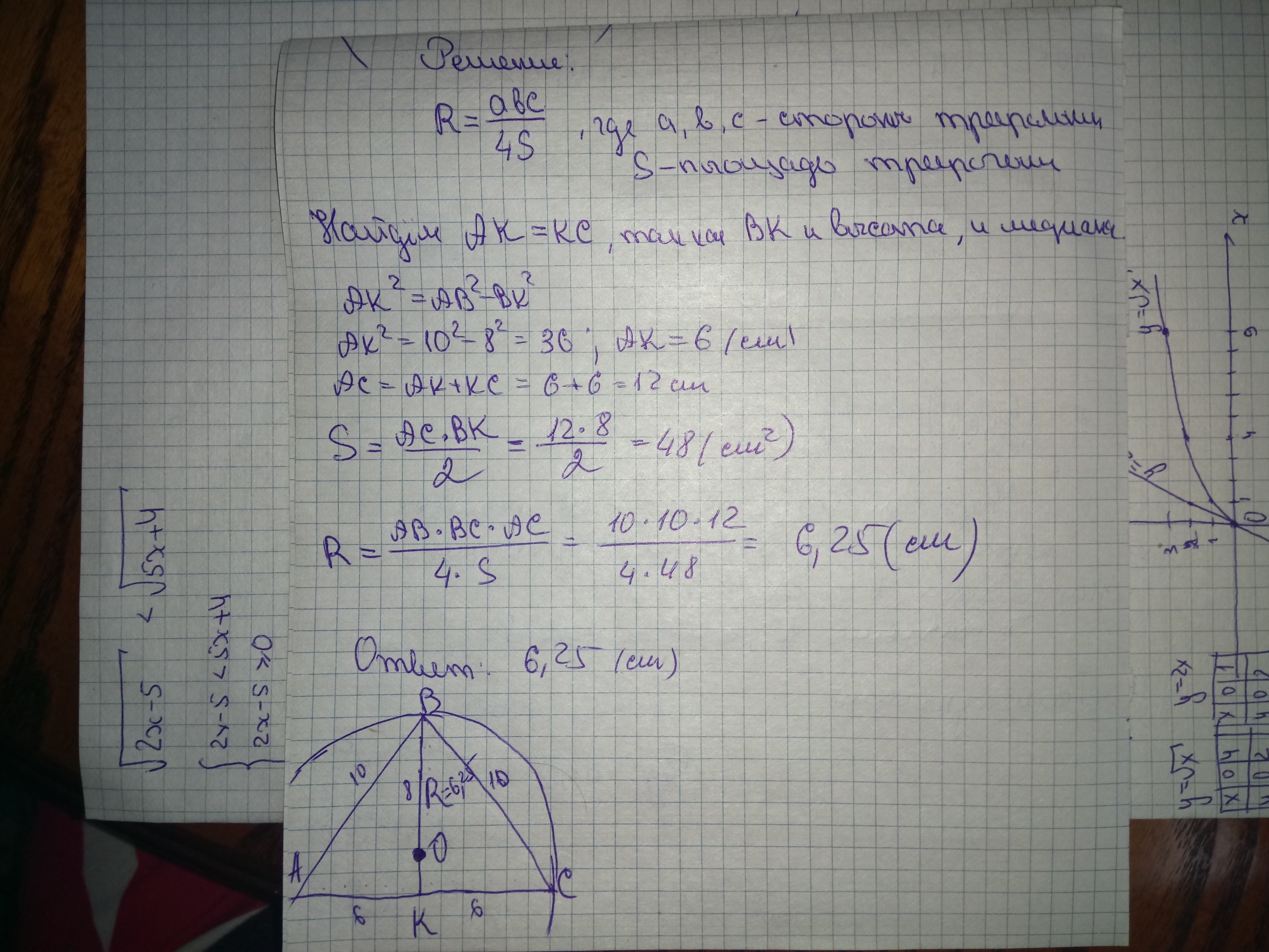 Длина боковой стороны равнобедренного треугольника равнва 10 см, а высота, проведенная из его вершины к основанию , равна 8 см. Вычислите радиус окружности, описанной около этого треугольника.