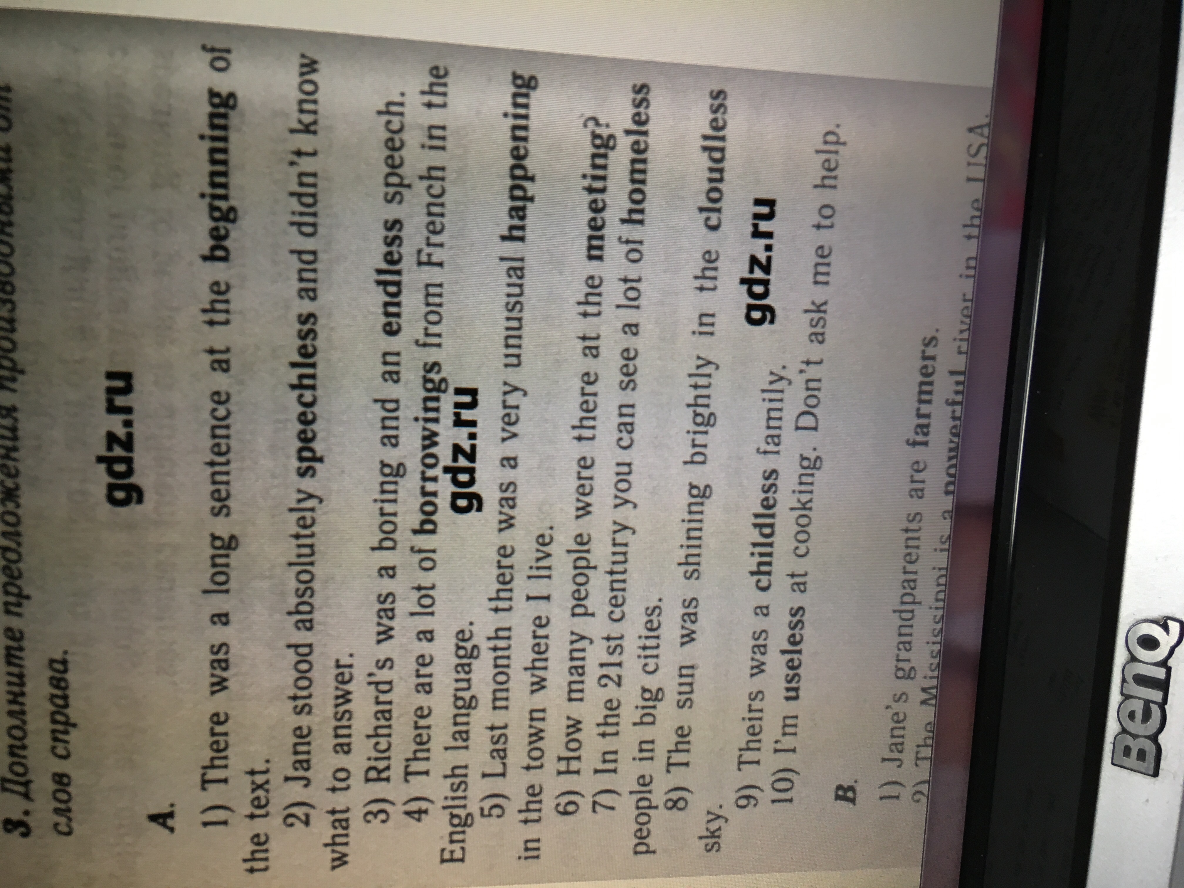 1)В начале текста было длинное предложение.2) Джейн стояла совершенно безмолвно и не знала, что ответить.3) У Ричарда была скучная и бесконечная речь.4) В английском языке есть много заимствований из французского языка5) В прошлом месяце в городе, где я живу, произошло очень необычное событие6) Сколько людей было на собрании?7) В 21 веке вы можете увидеть много бездомных в больших городах.8) Солнце ярко светило в безоблачном небе.9) Они были бездетной семьей10) Я бесполезен в приготовлении пищи. Не просите меня помочь