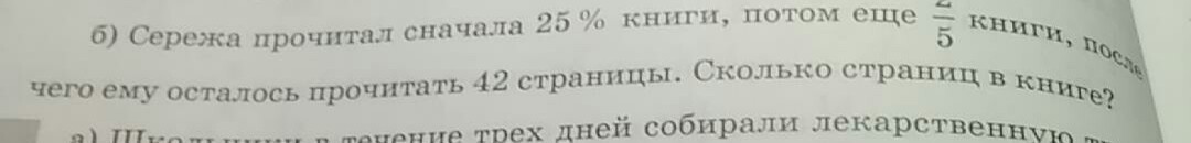 сережа прочитал 25% книги, потом еще две пятых книги, после чего ему осталось прочитать 42 страницы сколько страниц в книге