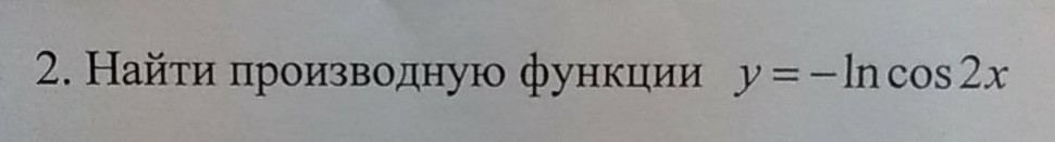 Сначала производную логарифма умножаем на производную косинуса, потом на производную 2х. После преобразований получаем хороший ответ: