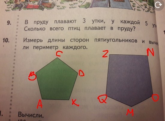 Измерь длины сторон пятиугольника и вычисли периметр каждого. У зеленого все стороны 2 см. У синего 3 стороны 3см а 2 по 2 см. Как все записать в тетрадь?