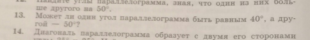 Не может, т.к. исходя из признаков параллелограмма , его противоположные углы равны. Если два противоположных угла будут равны 40, а другие два по 50 - нам следует сложить сумму всех углов ( должно получится 360 ) . Итак, 40+40+50+50 = 180 . Следовательно, так нельзя .