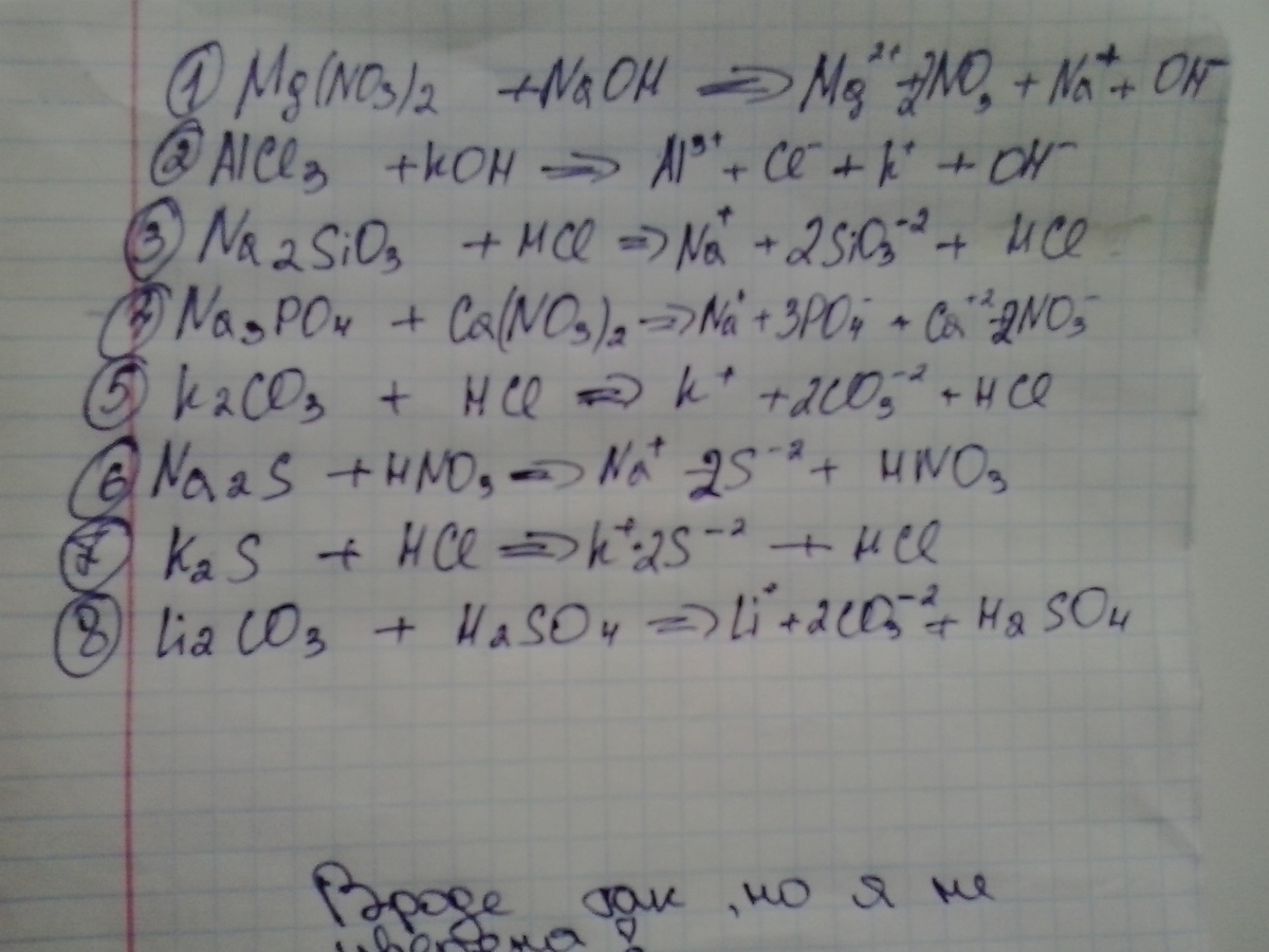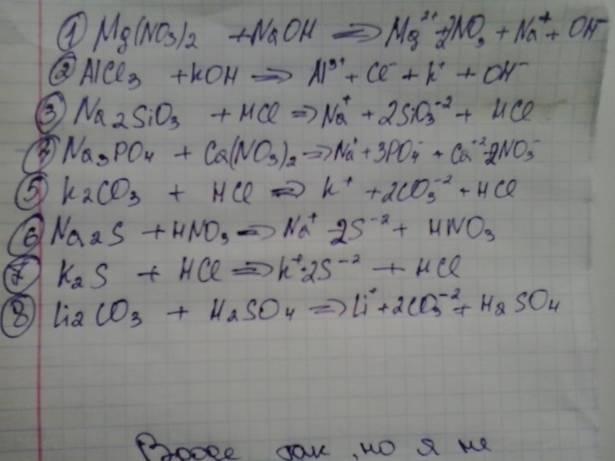 написать уравнения диссоциации (полные и краткие) 1)Mg(NO3)2+NaOH 2)AlCl3+KOH 3)Na2SiO3 +HCl 4)Na3PO4+Ca(NO3)2 5)K2CO3+HCl 6)Na2S+HNO3 7)K2S+HCl 8)Li2CO3+H2SO4