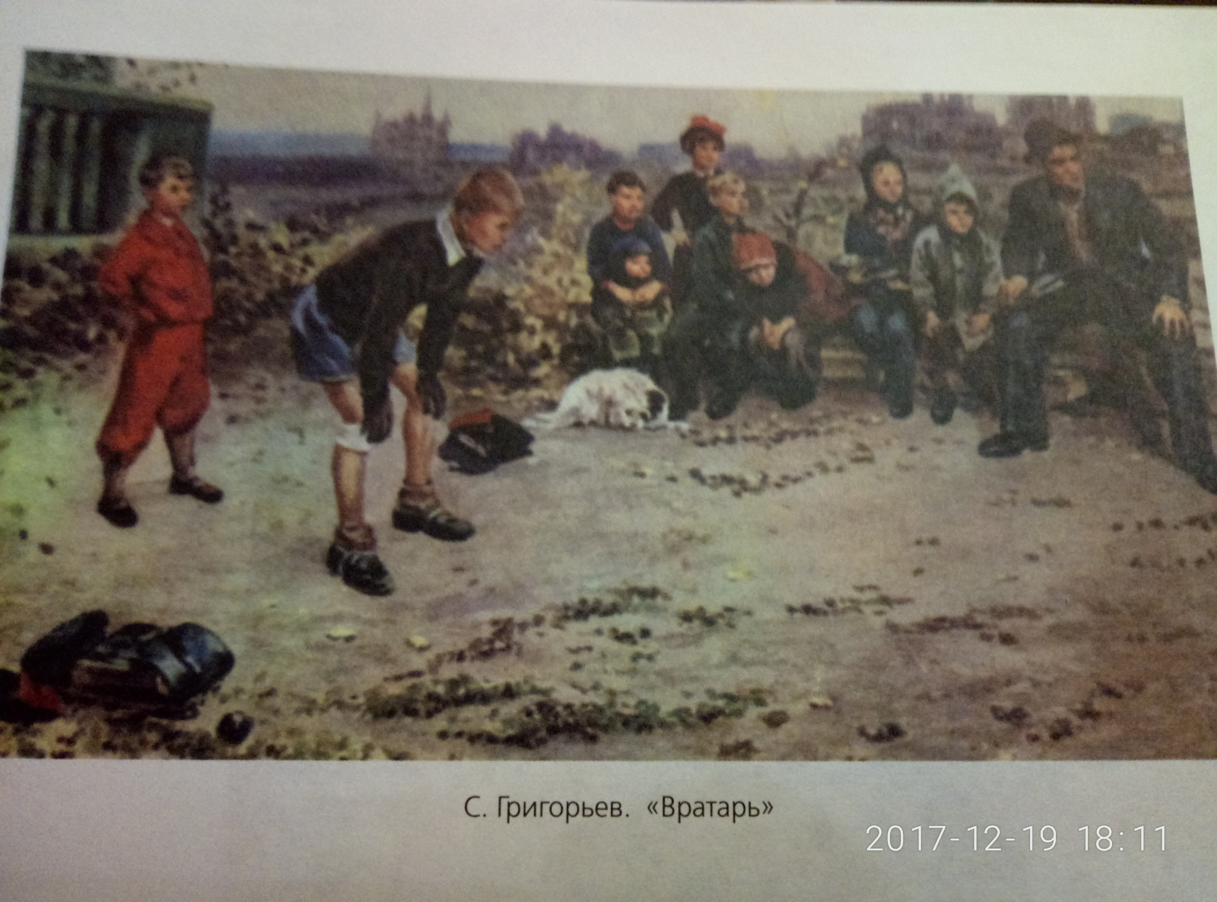Картина Григорьева С.А. «Вратарь» написана неяркими, сероватыми красками в 1949 году. На ней мы видим, что мальчишки играют в футбол.Пожелтевшая листва и одежда персонажей, говорят о том, что на дворе тёплый осенний день.На картине мы видим разбросанные по полю портфели мальчишек, это и подтолкнуло на мысль, что ребята решили сыграть в футбол после учёбы.На заднем плане мы можем хорошо рассмотреть зрителей этого матча. Среди них есть две девочки, четыре мальчика и маленький малышок, белая с чёрным пятнышком собака, которой явно всё равно игра ребят и мужчина, заинтересованный игрой!Так же можно увидеть мальчугана, одетого в красный костюм, который явно хотел играть, но увы его не взяли в команду, так как он меньше других ребят.Главный персонаж этой картины — вратарь. Его поза передаёт напряжённость и ожидание. Он внимательно следит за игрой и наверняка готов к атаке с другой команды. Одет он довольно таки простенько и бедно: Синие шорты, школьная рубашка с воротником, школьные удлинённые чёрные туфли и чёрные перчатки, защищающие от удара меча.Я думаю, что художник хотел показать азарт самой игры. Мне понравилась эта картина, тем, что её автор чётко передал эмоции персонажей и всю обстановку игры.