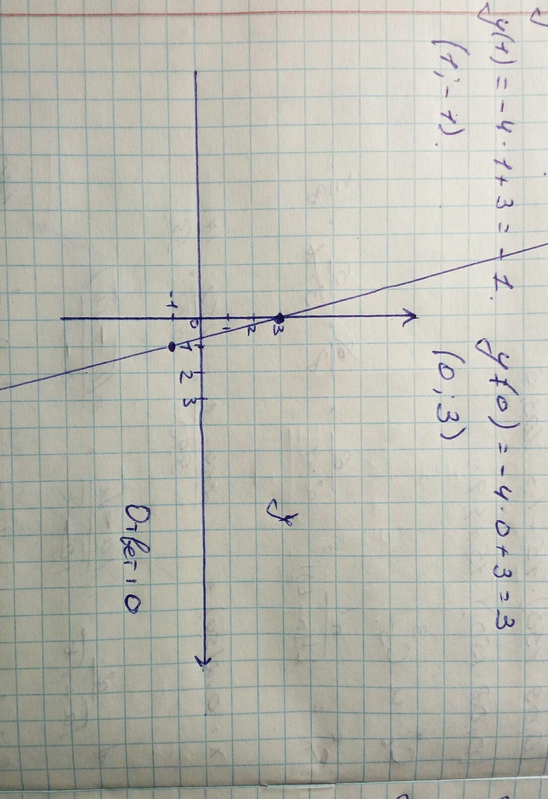 Постройте график функции у=-4х+3. Укажите с помощью графика, при каком значении х значение у равно 3.