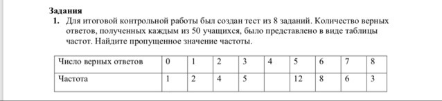 ответов, полученных каждым из 50 учащихся, было представлено в виде таблицы частот. Найдите пропущенное значение частоты.