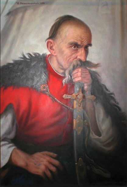 він вдягнений в червону сорочку і чорну накитку.його погляд кримезний та злий,готовий на самопожертву.його сильні руки тримають козацьку шаблю.складається враження,що козак роздумує про долю батьківщини.він має мужню вдачу,як справжній борець за народну волю.