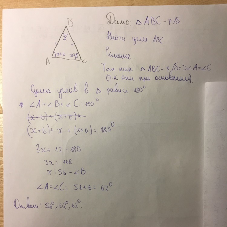 В равнобедренном треугольнике АВС угол при основании больше угла при вершине В на 6 градусов больше. Найти углы АВС