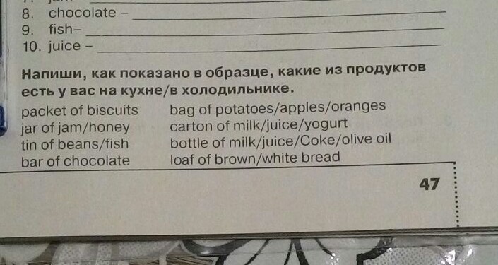 английский язык.Напиши как показано в образце какие из продуктов есть у вас на кухне в холодильнике