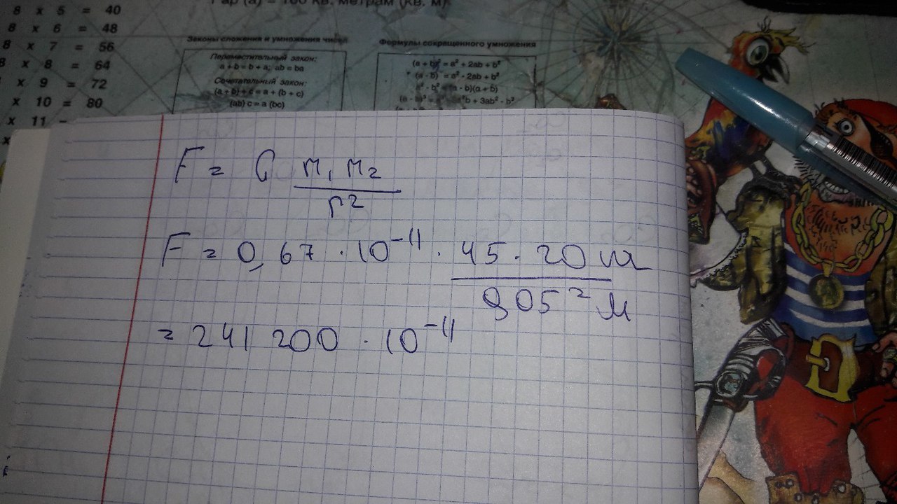 Определите силу всемирного тяготения, действующую между телами, если их масса равна 45 кг и 200 кг и находятся они на расстоянии 0,05 км.