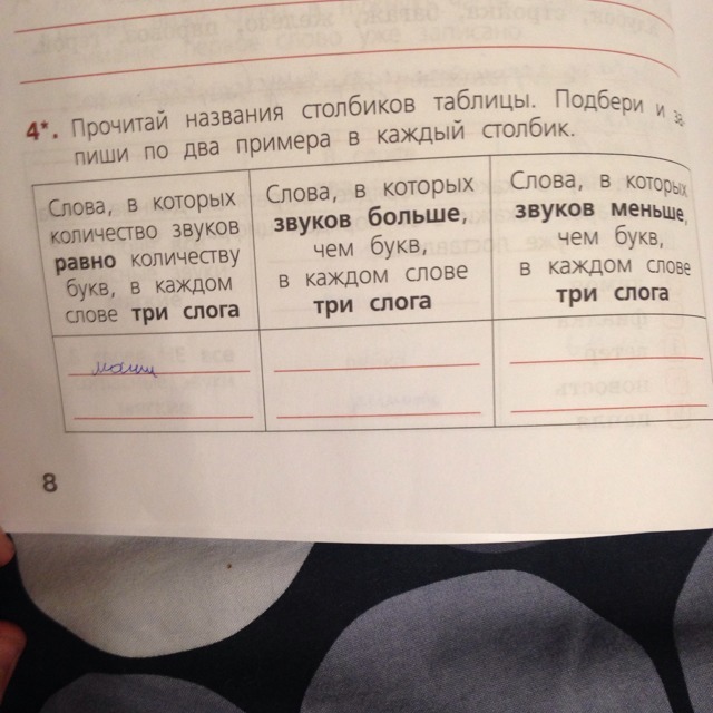1 столбик: слова, в которых количество звуков равно количеству букв в каждом слове, три слога: па-ра-шют [парашут: 7букв 7 звуков], со-ба-ка [сабака: 6 букв 6 звуков].