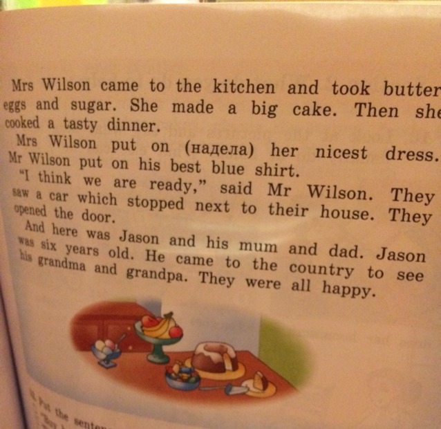 Миссис Уильсон зашла на кухню и взяла масло, яйца и сахар. Она сделала большой торт. Потом она приготовила вкусный обед. (2абзац)Миссис Уильсон надела ее самое красивое платье. Мистер Уильсон надел его самую лучшую рубашку.(3абзац)"Я думаю мы готовы " сказал Мистер Уильсон. Они увидели машину, кторая остановилась перед их домом. Они открыли дверь. (4 абзац) И там был Джейсон и его мама с папой. Джейсону было 6 лет. Он приехал в страну, чтобы увидеть его бабушку и делушку. Они все были счастливы.