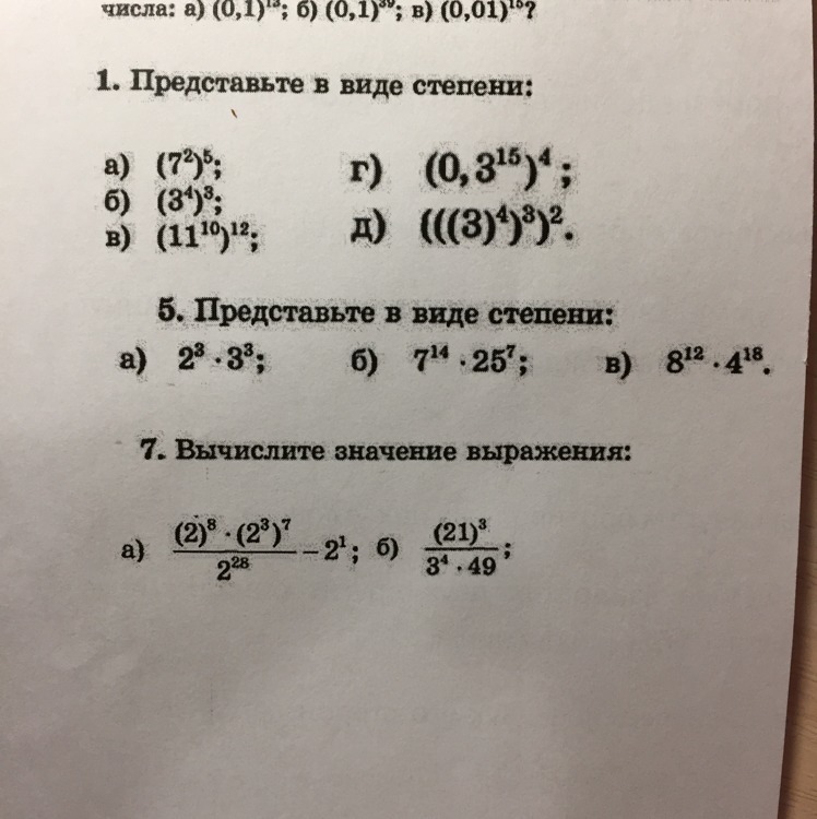 1. \ a)  { ({7}^{2}) }^{5}  =  {7}^{10}  \ b) { ({3}^{4} )}^{3}  =  {3}^{12}  \ c) { ({11}^{10} )}^{12}  =  {11}^{120}  \ d) { ({0.3}^{15} )}^{4}  =  {0.3}^{60}  \ e) { { ((({3})^{4} )}^{3}) }^{2}  =  {3}^{24} \ 5. \ a) {2}^{3}  times  {3}^{3}  =  {6}^{3}  \ b) {7}^{14}  times  {25}^{7}  =  {7}^{14}  times  {5}^{14}  =  {35}^{14}  \ c) {8}^{12}  times  {4}^{18}  =   {2}^{36}  times  {2}^{36}  =  {4}^{36}  \ 7. \ a) frac{ {2}^{8} times  {2}^{21}  }{ {2}^{28} }  - 2 =  frac{ {2}^{29} }{ {2}^{28} }  - 2 = 2 - 2 = 0 \ b) frac{ {21}^{3} }{ {3}^{4} times 49 }  =  frac{ {7}^{3} times  {3}^{3}  }{ {3}^{4} times  {7}^{2}  }  =  frac{7}{3}