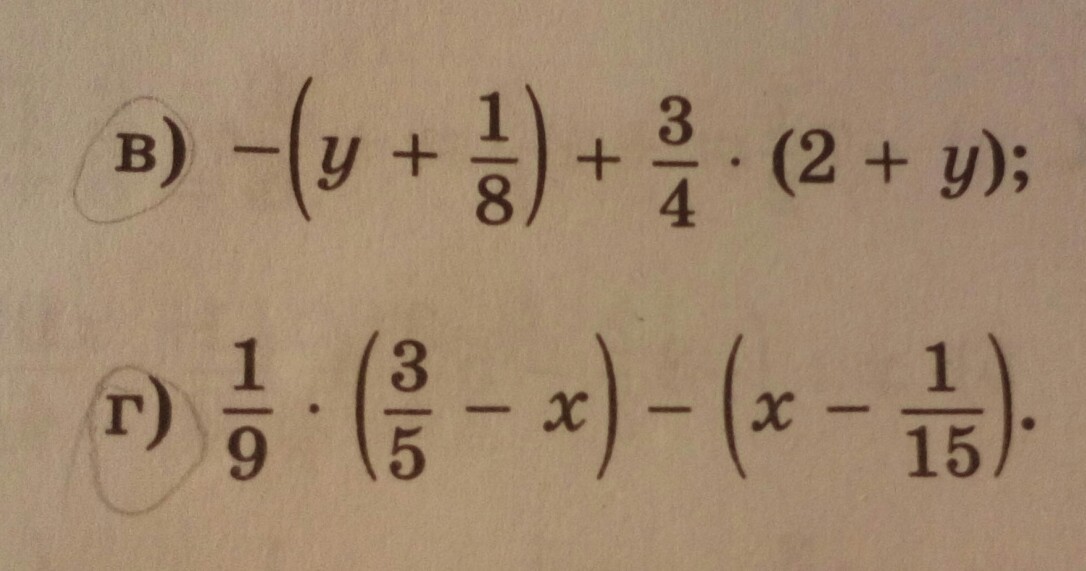 в)=-(у+1/8)+3/4×(2у)=-у-1/8+3/4×2у=-у-1/8+3/2у=у/2-1/8