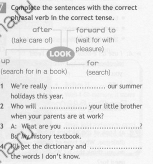 If you have a cat you should look after it. I look forward to the winter holidays. He always looks for his phone. You can look up the new words in the dictionary.
