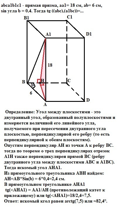 tg(<AHA1) = АА1/АН (противолежащий катет к прилежащему) или tg(<AHA1)=18/2,4=7,5.