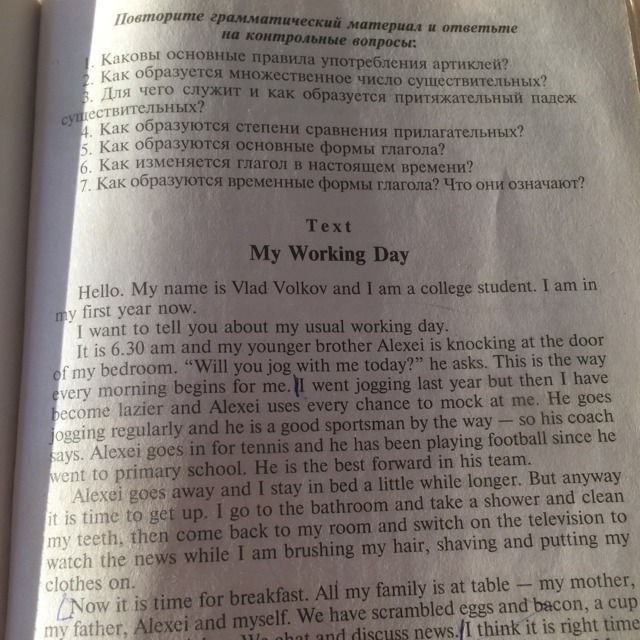 я прибываю в моем колледже как раз вовремя, чтобы поздороваться с моими однокурсниками до звонка идет. как правило, у нас есть три или четыре периода каждый день. мы идем в колледж пять дней в неделю. Суббота и воскресенье наши выходные.у нас есть лекции и семинары. иногда мы работаем в мастерских. на мой взгляд, это самые красивые уроки. мои друзья говорят, что у нас будет тест на английском языке сегодня. я думаю, что писать тесты в грамматике труднее, чем говорить по-английски. я надеюсь, что не подведет.