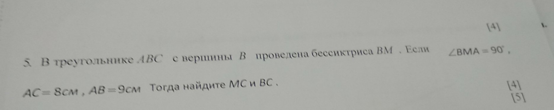 в треугольнике ABC с вершины B проведена бессиктриса BM. Если BMA=90° AC=8см, AB=9см Тогда найдите МС и БС