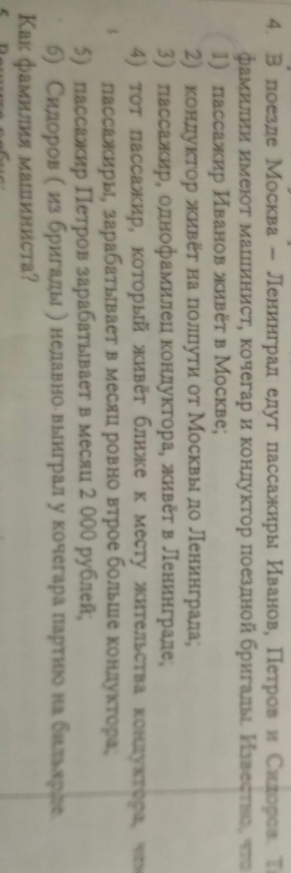 Кондуктор живёт на полпути от Москвы до Ленинграда (2). Один пассажир живёт в Москве (1), другой в Ленинграде (3). Значит, ни тот, ни другой не являются ближайшими соседями кондуктора (4). Ближайшие соседи не Иванов (живёт в Москве) и не Петров (2000 не делится на 3), а Сидоров. Сидоров не кондуктор (3), не кочегар (6). Значит, Сидоров - машинист.
