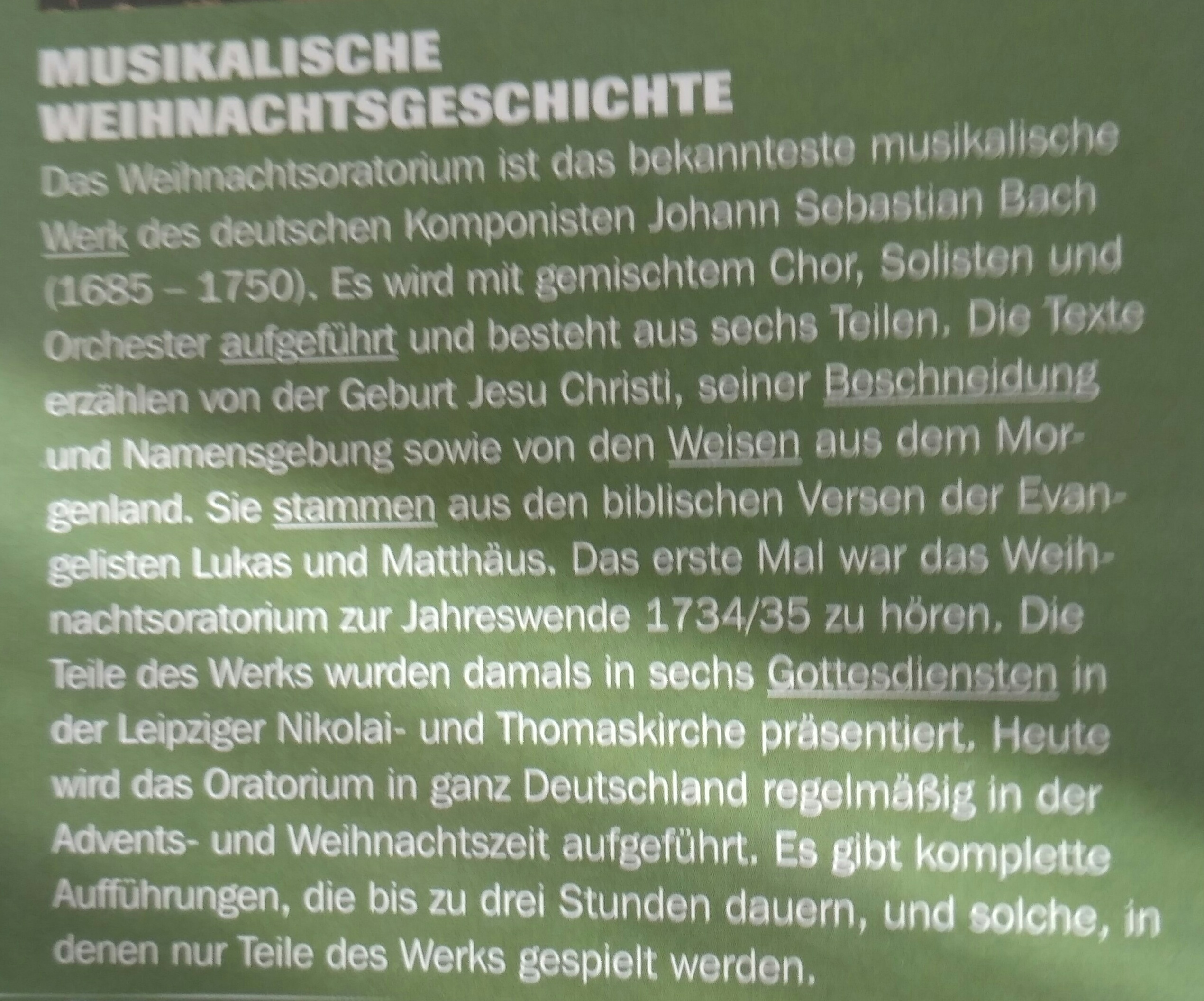 Рождественская оратория - самая известная музыкальная работа немецкого композитора Иоганна Себастьяна Баха (1685-1750). Он исполняется со смешанным хором, солистами и оркестром и состоит из шести частей, тексты рассказывают историю рождения Иисуса Христа, его обрезание и называние, а также мудрецы из Моргенленда. Они исходят из библейских стихов евангелистов Луки и Матфея. Впервые состоялось освящение, которое вышло на рубеже 1734/35 года. Затем часть работы была представлена в шести службах в церкви Николая и Св. Томаса. Сегодня оратория в Германии регулярно проводится в Адвенте и Рождестве, Есть полные спектакли продолжительностью до трех часов, и те, в которых играют только части произведения.