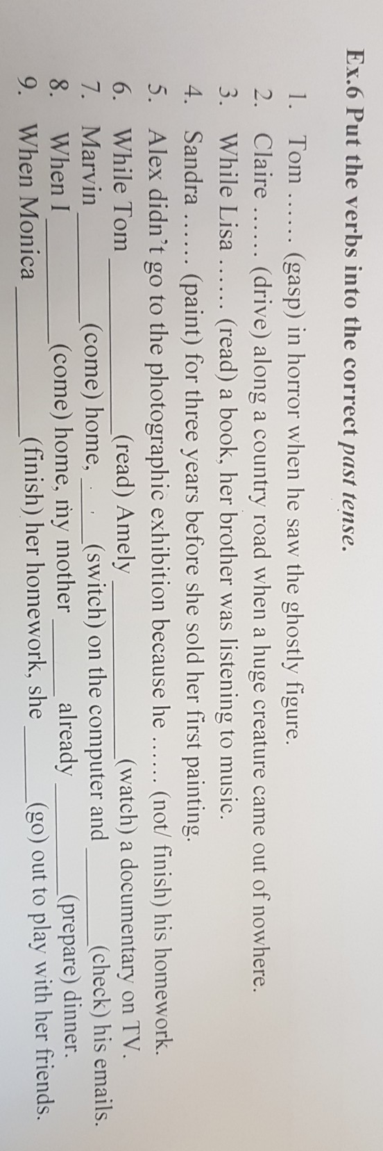 1 Tom gasping 2 driveing 3 reading 4 painting 5 not 6 reading,watching 7 comeing и так далее просто добавляешь инговое окончание