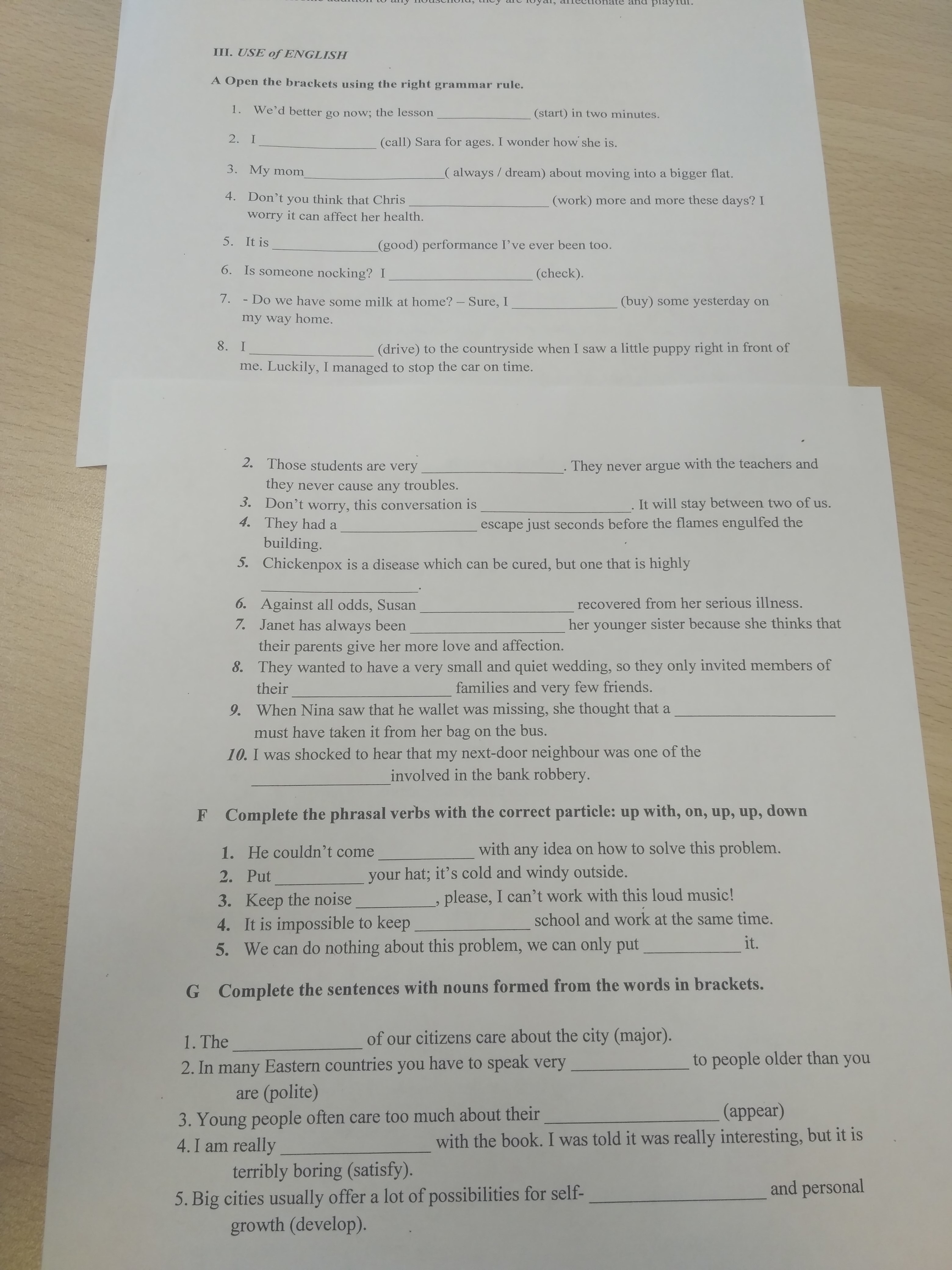 F. 1.come up2 put on.3.down4.keep up with 5put up