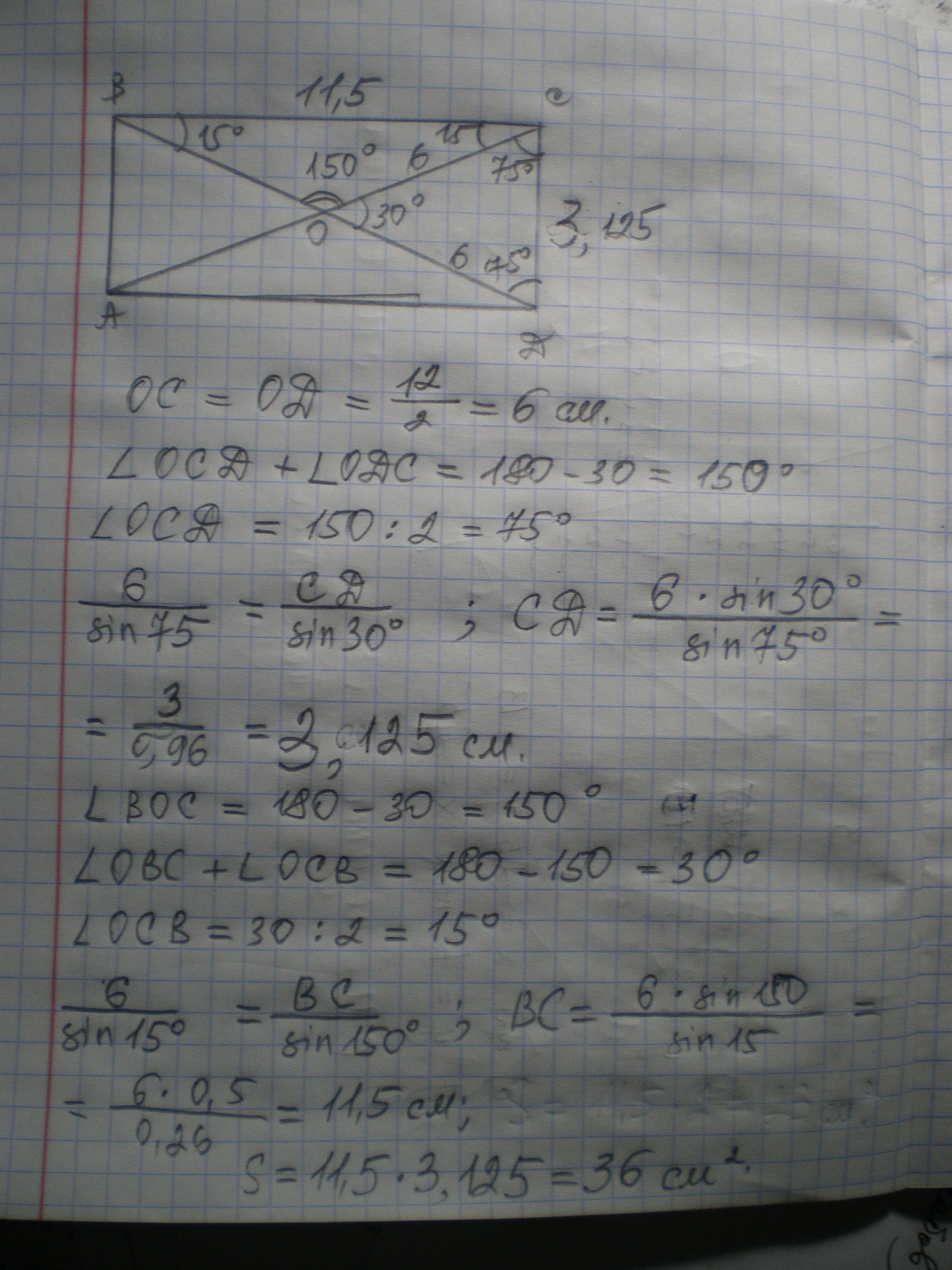 Кут між діагоналями прямокутника дорівнює 30 градусів Знайти площу прямокутника якщо його діагональ дорівню 12см. решыте срочно!!!!!