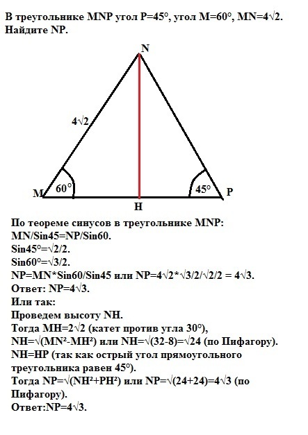 NP=MN*Sin60/Sin45 или NP=4√2*√3/2/√2/2 = 4√3.