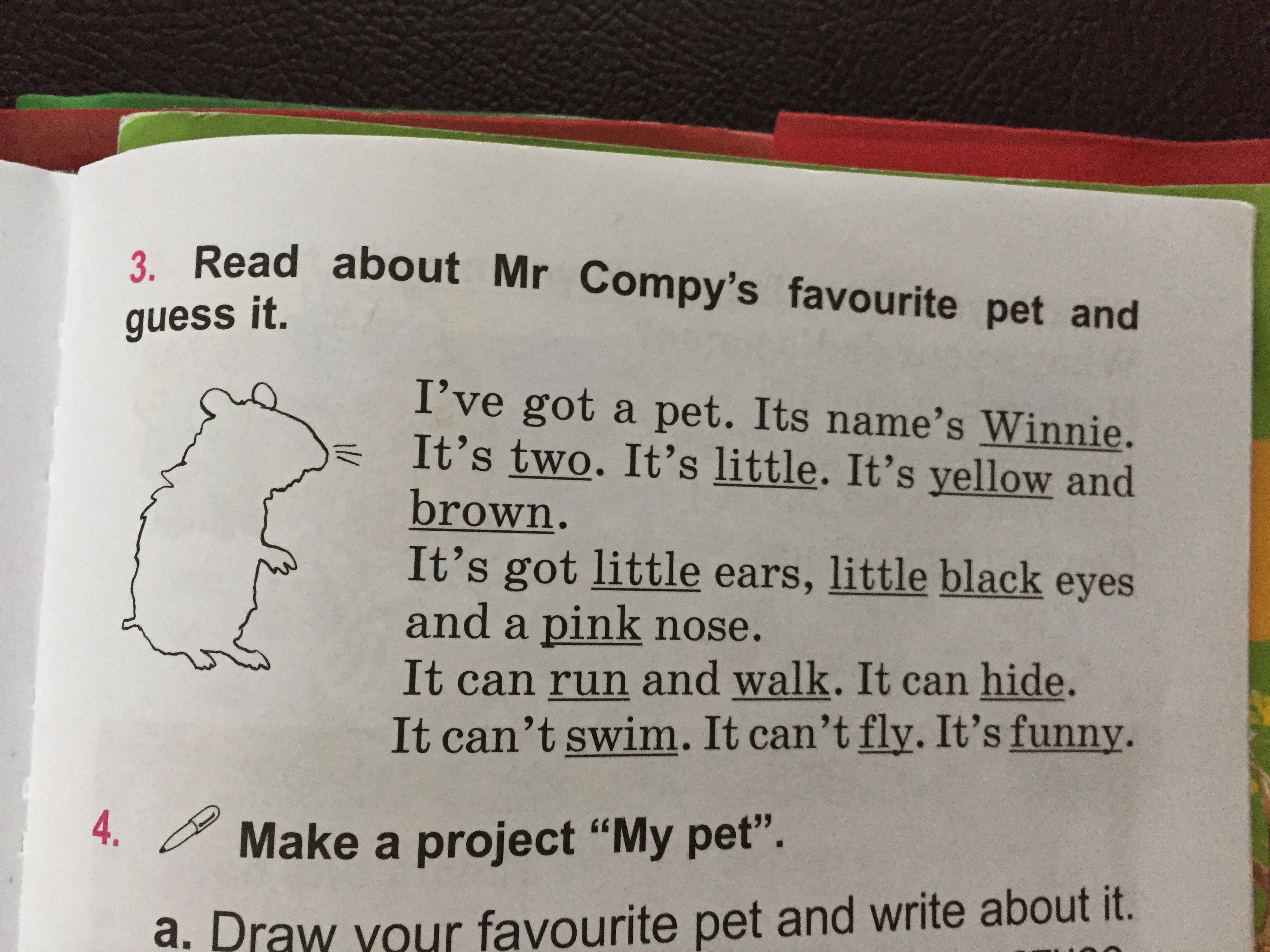 у меня есть питомец. Его имя винни. ему два. он жёлтого и коричневого цвета. У него маленькие уши, маленькие черные глаза,и розовый нос. он может бегать и ходить. он может прятаться. он не умеет плавать. он не может летать. он забавный.