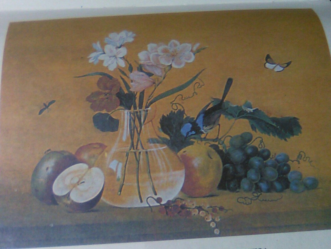 я вижу на картине прекрасную природу .Которая переливается разными летними цветами .Мне понравилось в этой картине то что она летняя ,мне напоминает это прекрасное лето птицы ,цветы , фрукты.