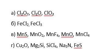 в) Mn^+2 S^-2, Mn^+4 O^-2, Mn^+4 F^-1, Mn^+2 O^-2, Mn^+4 Cl^-1