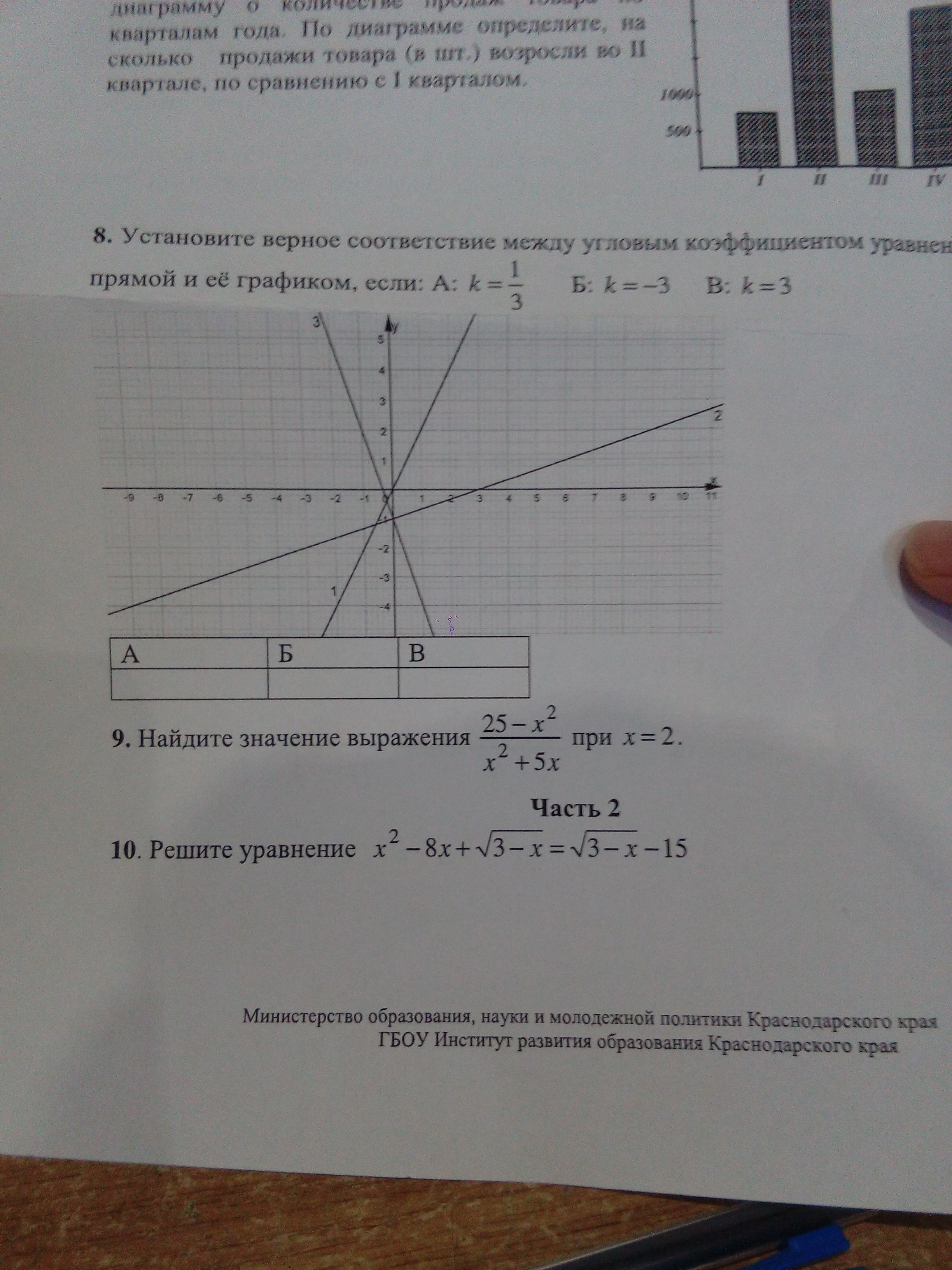 8:тангенс угла наклона равен угловому коэффиценту,поэтому можешь просто достроить треугольники у каждой из этих прямых,знак зависит от того как направленна прямая,слева направо убывающе значит минус и наоборот,таким образом А:2 Б:3 В:1