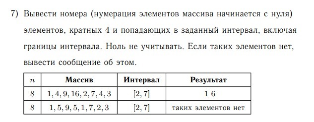 Вывести номера (нумерация элементов массива начинается с нуля)