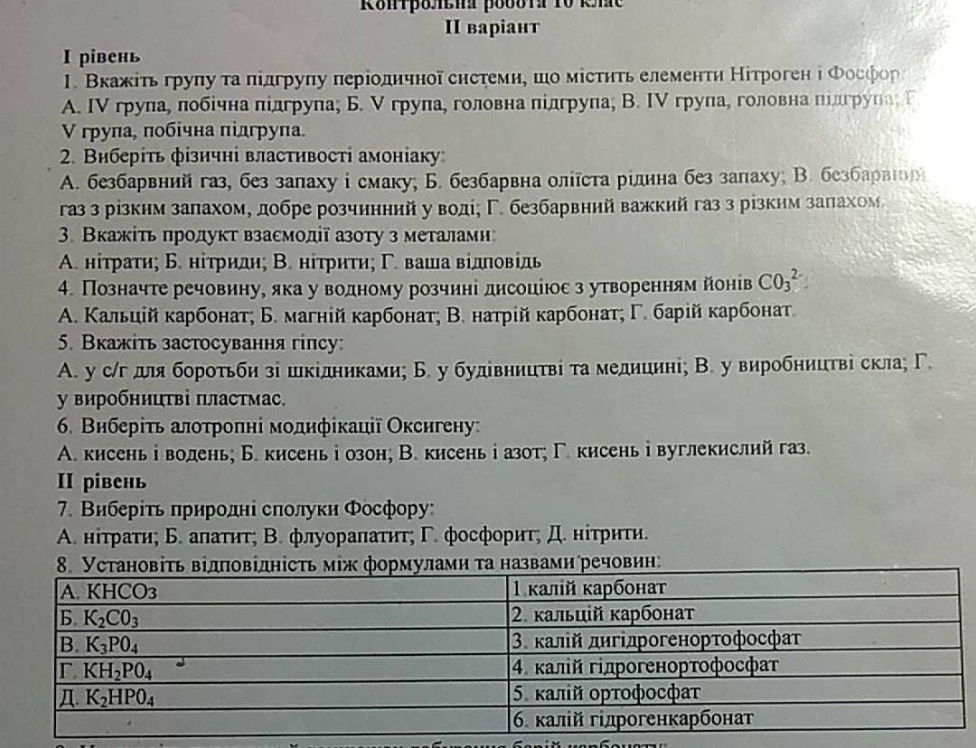 1) Вкажіть групу та підгрупу періодичної системи, що містить елементи Нітроген і Фосфор: