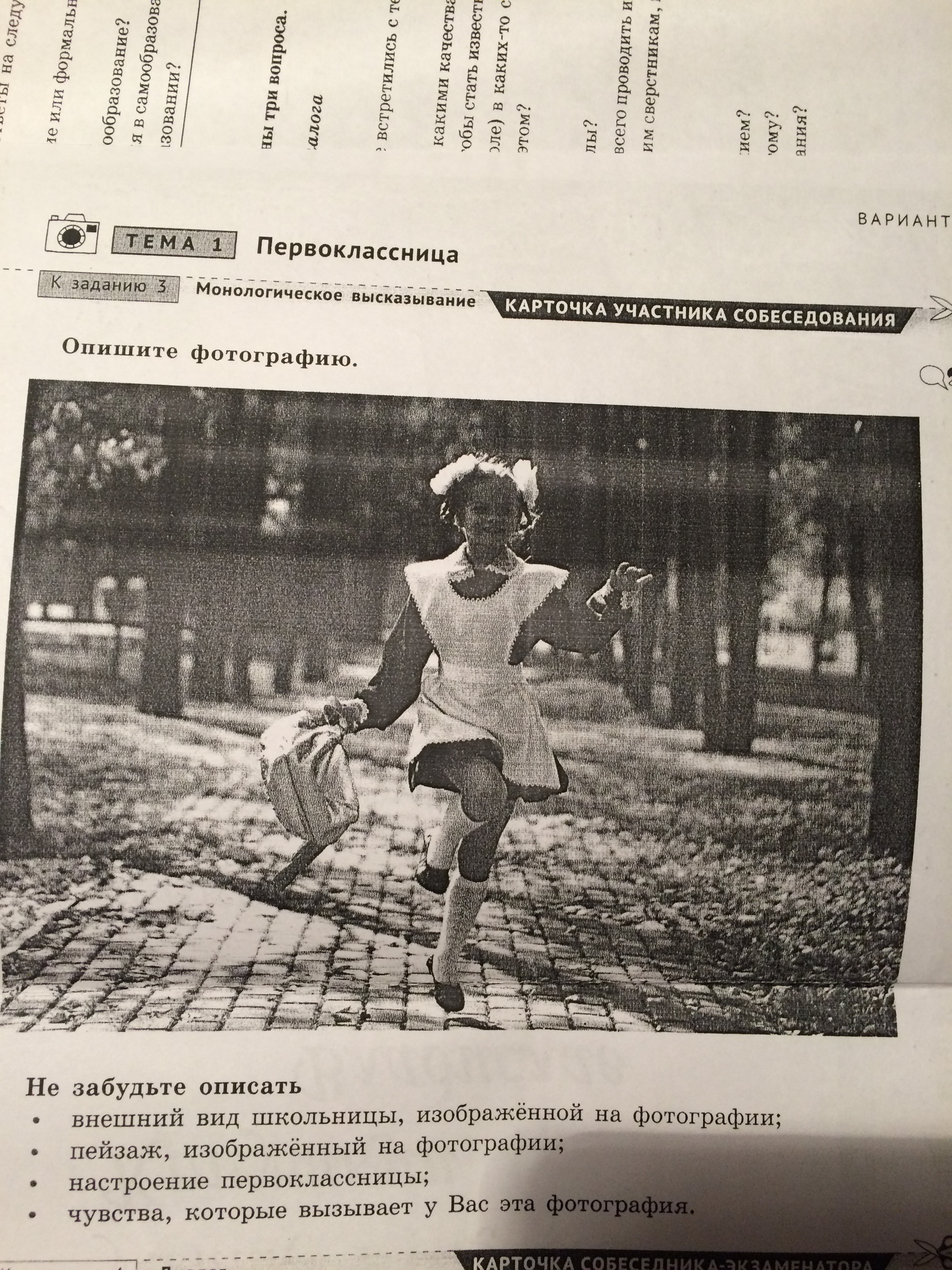 на фотографии изображена опрятная девочка с двумя косичками, красивом белом фартучке.видно что скоро летние каникулы потому что, выросла травка, а на деревьях есть листочки.у первоклассницы весёлая и радостная улыбка.эта фотография вызвала у меня чувство радости и веселья по приближению летних каникул.