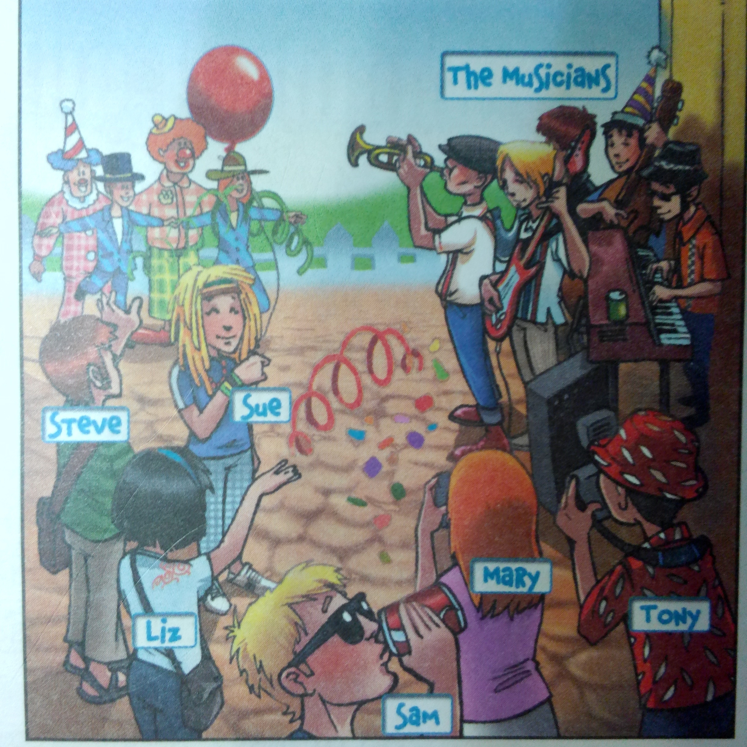 The musicians are playing on musical instruments. Mary and Tony are taking photographs of clowns. Sam is drinking coke. Liz, Steve and Sue are listening the music.