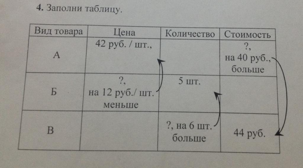 Ребята помогите решить задачу. 1) вид товара А цена 42 руб./шт. , кол-во - ?, стоимость на 40 руб. больше 2)вид товара Б цена - ? на 12 руб./шт. меньше, кол-во 5 шт, стоимость - ? 3) вид товара В цена - ?, кол-во- ? на 6 шт. больше, стоимость 44 руб.