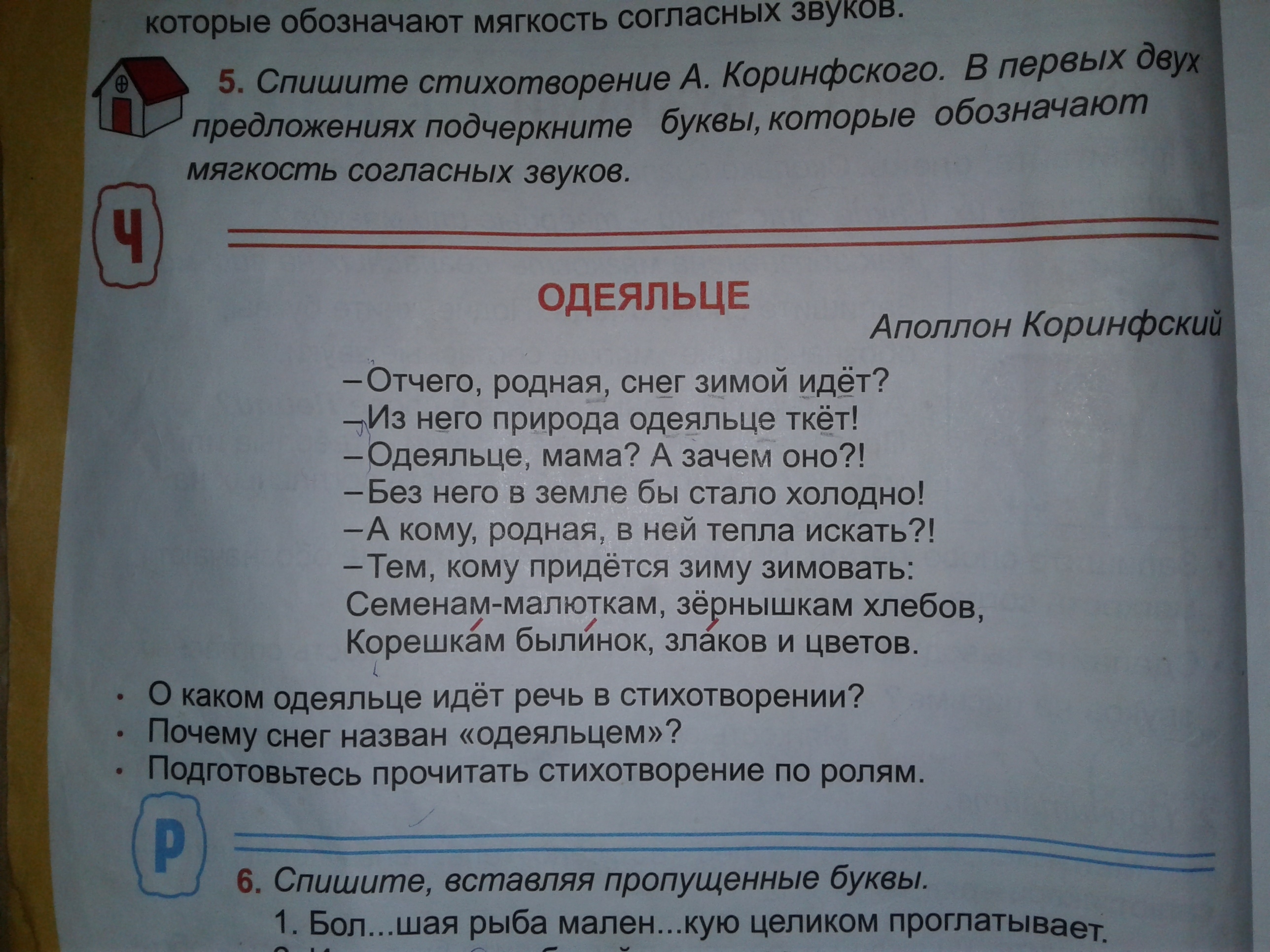 Спищите сттихотворения А.коринфского В первых двух предложениях подчеркните буквы, которые обозначают мягкость согласных звуков
