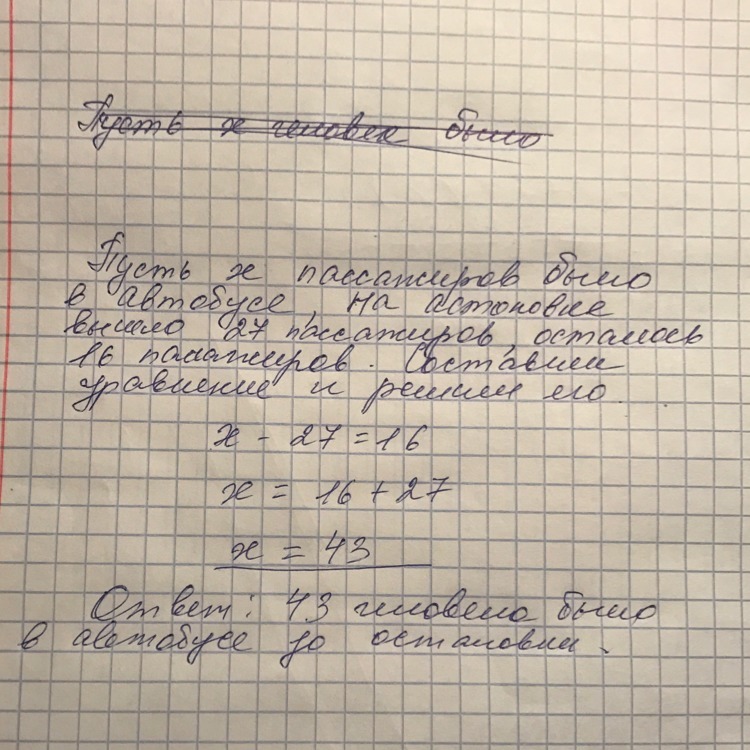 в автобусе ехало несколько пассажиров когда на остановке вышли 27 человек в автобусе осталось 16 пассажиров сколько пассажиров было в автобусе до остановки. алгебраическим способом