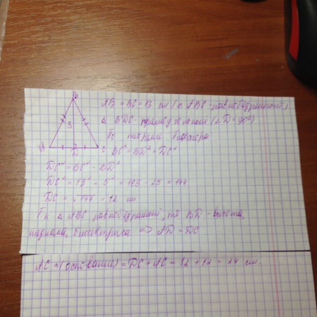 В равнобедренном треугольнике ABC с боковой стороной АВ-13 см, проведена высота BD-5 см. Найдите основание треугольника.