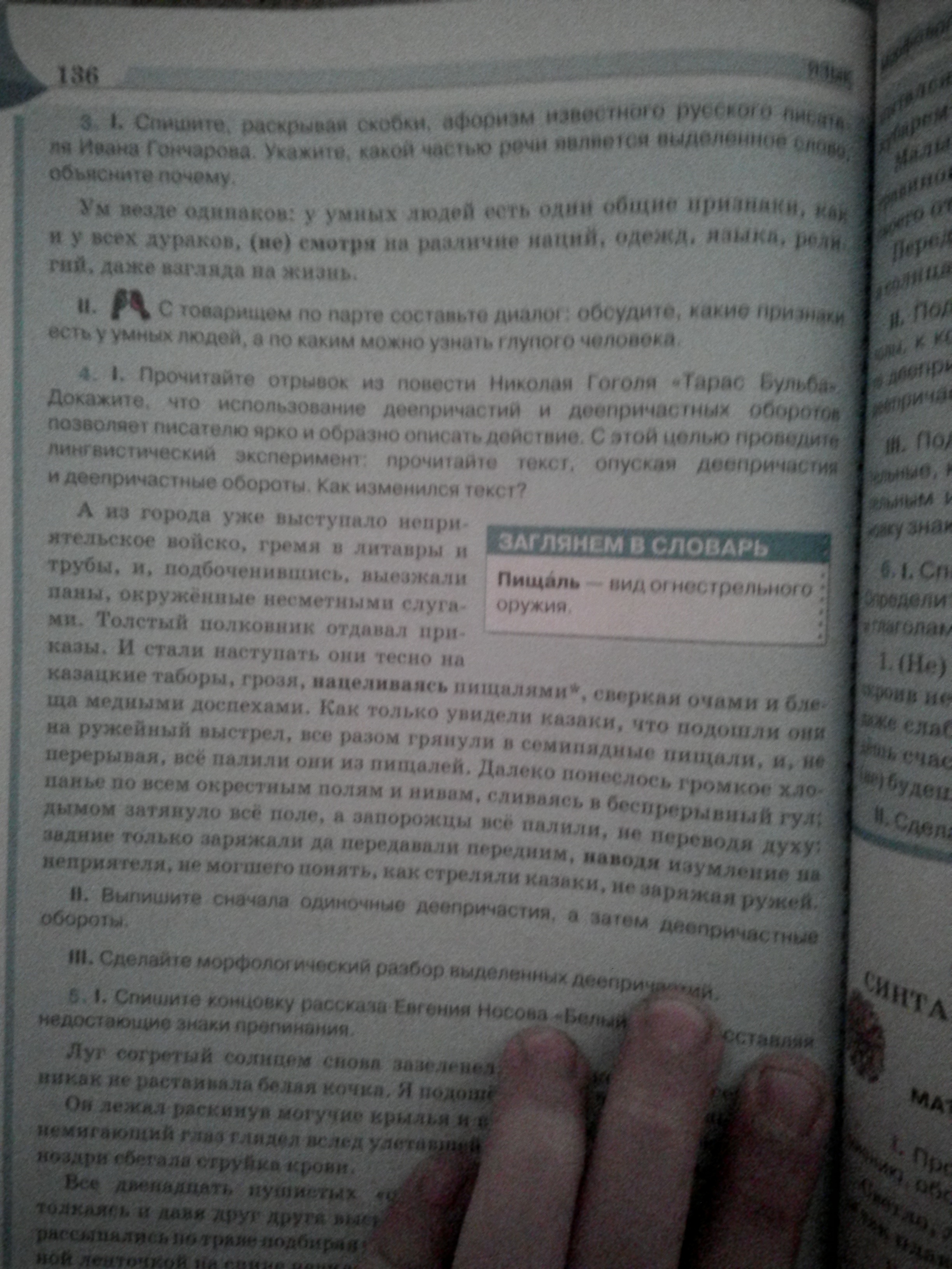 4 . Деепричастия в тексте " Тарас Бульба " дейсвительно делают текст более выразительным, добавляют ему звучания и делают смысл текста более понятным, скрашивая при этом произношение . Если опустить деепричастные обороты, многий смысл может быть непонятен и сам текст будет поставлен очень грубо , стилистические приемы будут отсутствовать .