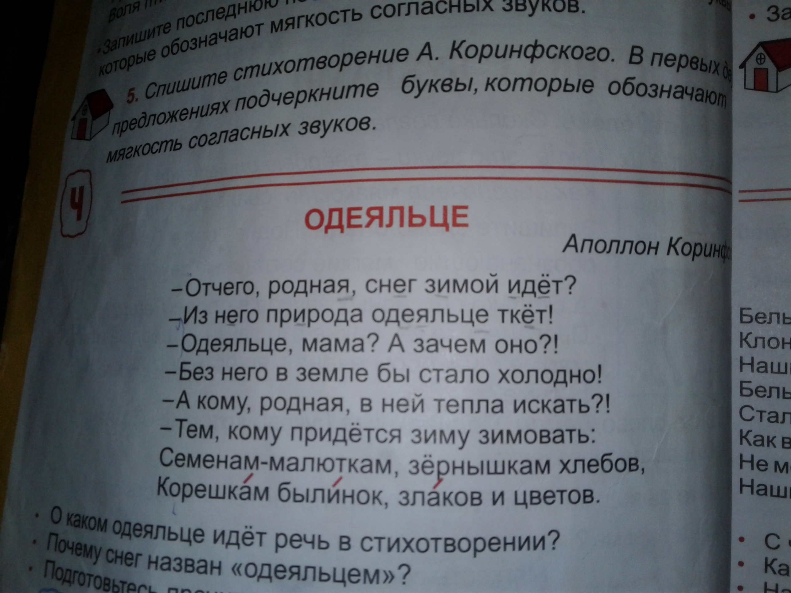 Спищите сттихотворения А.коринфского В первых двух предложениях подчеркните буквы, которые обозначают мягкость согласных звуков