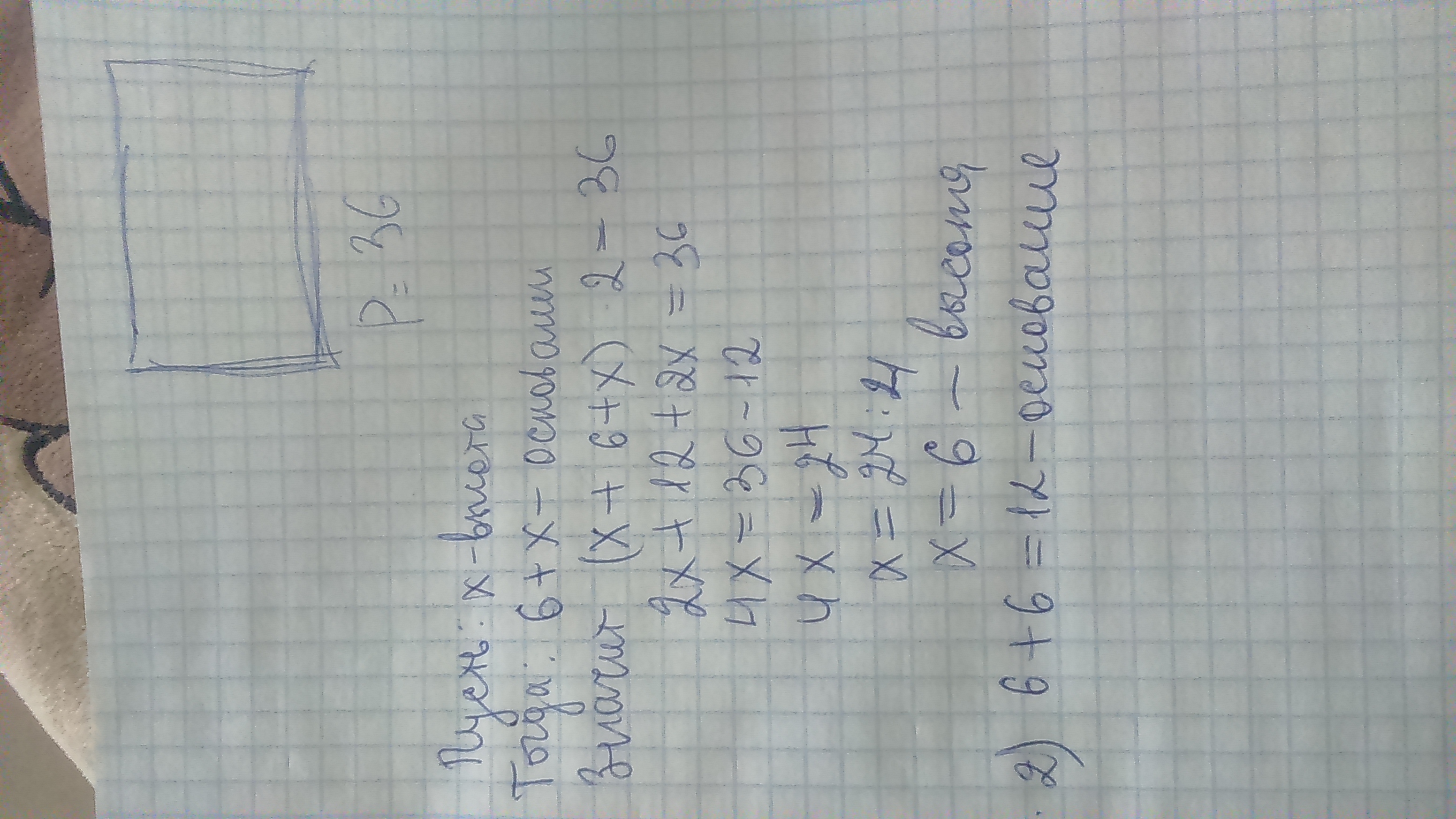 Помогите решить по действиям периметр прямоугольныка 36 дм, основание на 6 см больше высоты. Найдите стороны прямоугольныка.