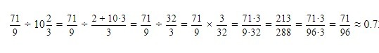 спасибо огромное за внимание, не ожидала, что так быстро получу ответ, на самом деле пример очень сложный для меня, пример из семи действий 7ц 1/9: 10ц 2/3-(49ц 1/3-47ц 2/5) : 29 : (107/200+3/8 * 1ц 6/25)