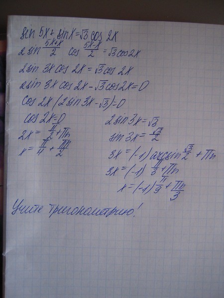 cos2x=0 это я получила, а второе уравнение 2sin= корень из 3, не понимаю откуда у вас sin 5x