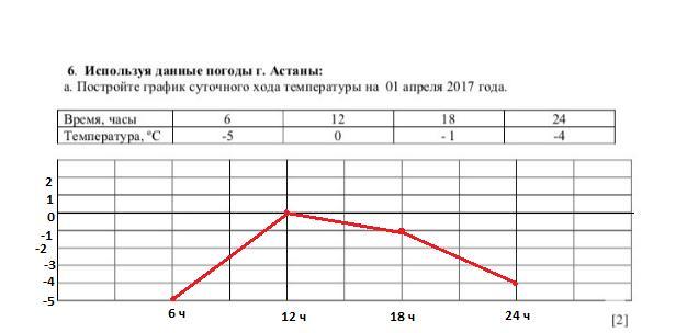 Используя данные погоды г.Астаны : Постройте график суточного хода температуры на 1 апреля 2017 года.Время 6 погода -5 ,время 12 погода 0, время 18 погода -1 , время 24 погода -4 даю 30 баллов