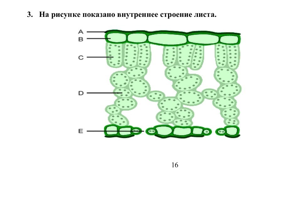 На рисунке показано внутренне строение листа. Объясните, как структуры В и Е способствуют процессу фотосинтеза?
